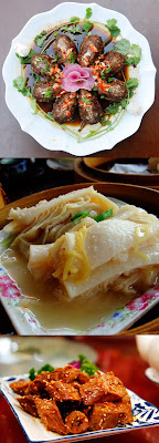 After taking the initial plunge and eating rabbit heads, I felt inspired to try a bunch of other strange foods. Some of the ones that I ended up trying include: pig’s feet, chicken’s feet, goose feet, duck neck (pictured on the left, bottom), duck tongue, cow brain, cow stomach (pictured on the left, middle), fish flotation bladder, donkey meat hotpot, stinky tofu, and dog meat. Some of the ones I still haven’t tried include: roasted scorpions on a stick and drunken shrimp. If you subscribe to Chinesepod you can check out a great advanced lesson on strange Chinese foods, 古怪食物
