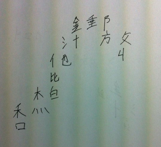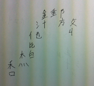 I starting with 金 as a radical, and created the following characters: 針, 汁,池, 他, 偕 (two components) , 柏,杰,秋,和. After 和, I started back over at 金 making: 錘,郵,防,放,收. |