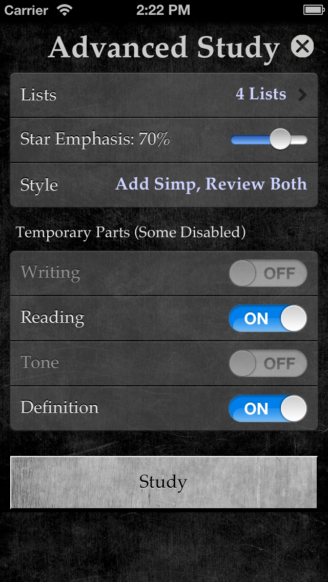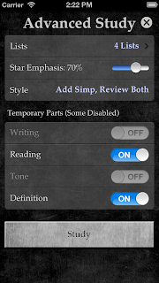 What else is new? We’ve added an Advanced Study mode, where you can be more specific about what you want to study. You can study just one list (or any subset of your lists). You can choose to emphasize your starred words. You can temporarily study a different character style or study parts–if today you just want to do simplified tones, or perhaps traditional writings and definitions, then head on over to Advanced Study.