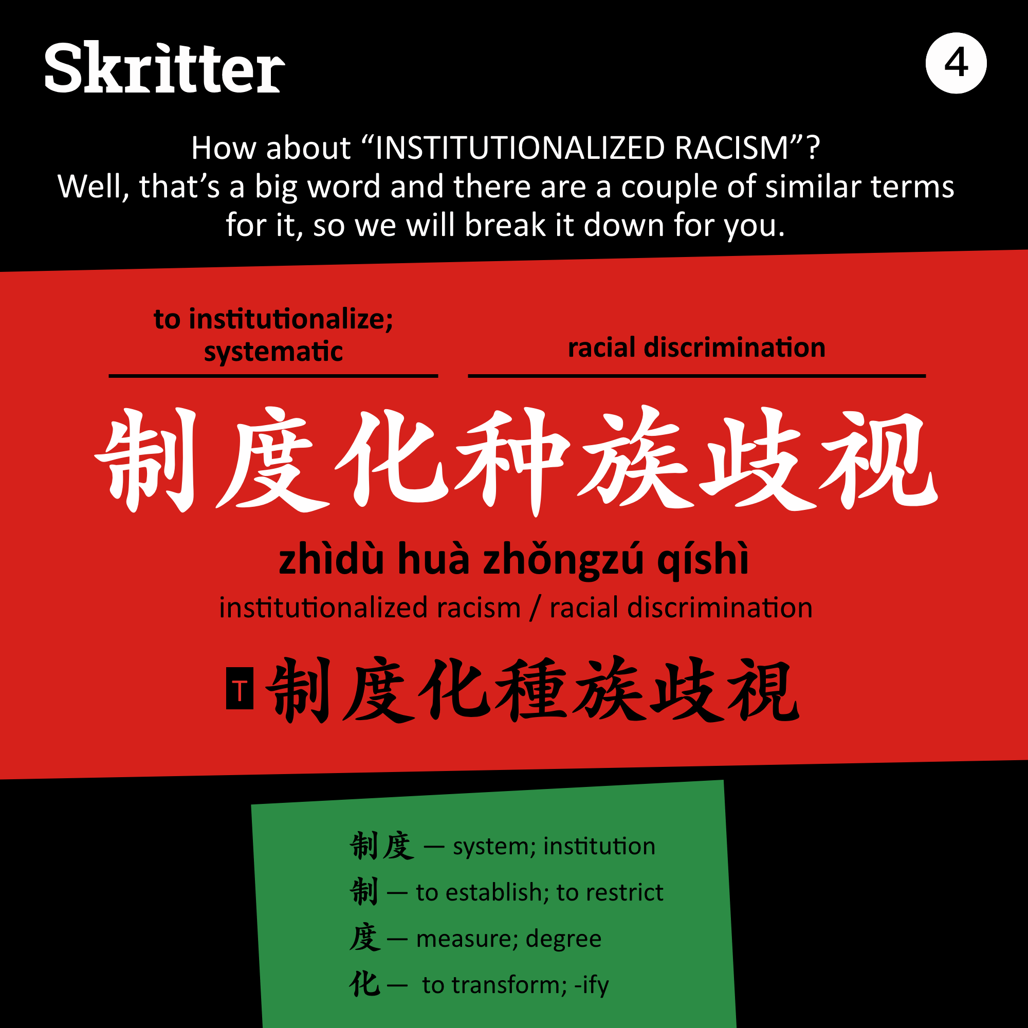 制度化种族歧视 / 制度化種族歧視 zhìdù huà zhǒngzú qíshì – institutionalized racism / racial discrimination