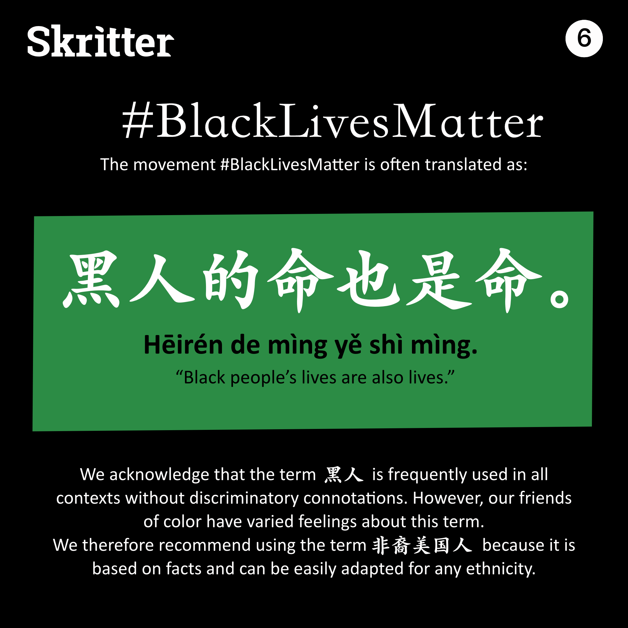 黑人的命也是命。Hēirén de mìng yě shì mìng – “Black people’s lives are also lives.” Black Lives Matter.