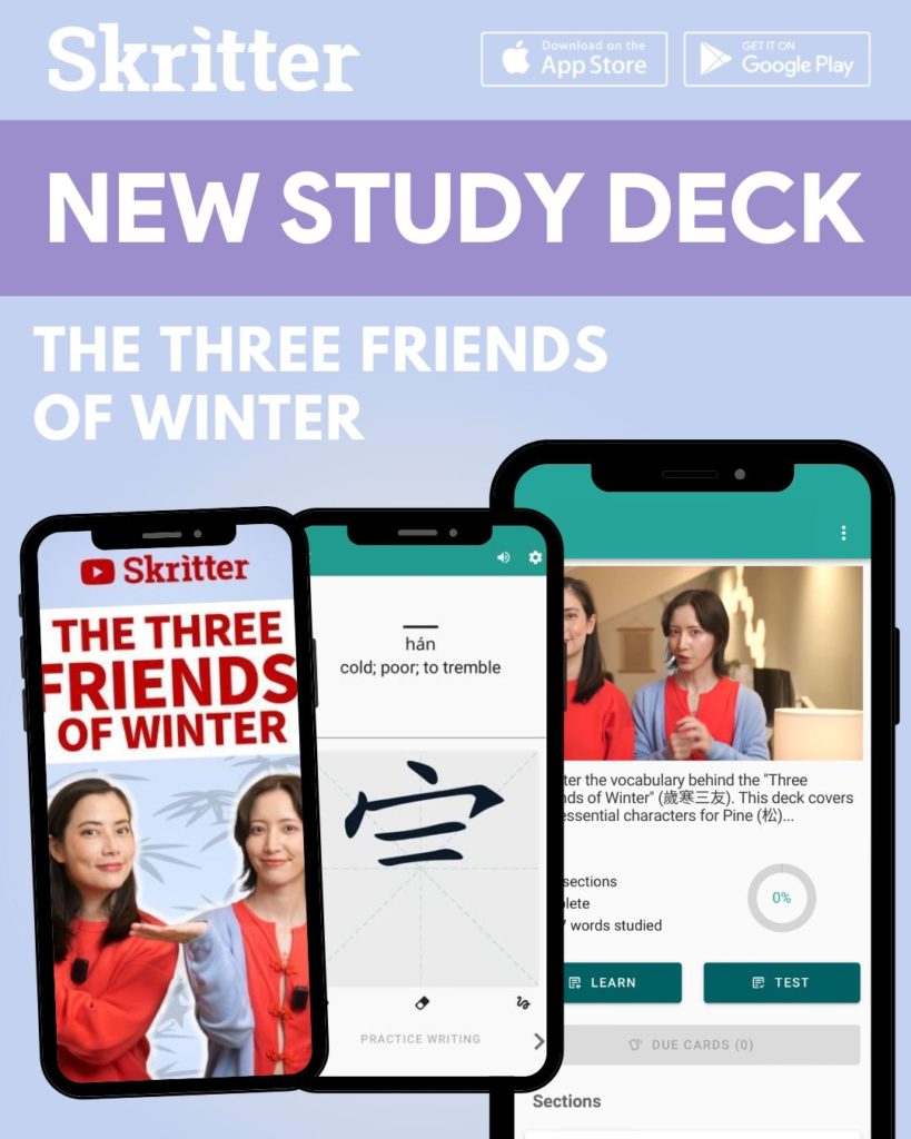 Want to learn the vocabulary from this post? Check out our curated deck on Skritter to master the characters for Pine, Bamboo, Plum, and more!
