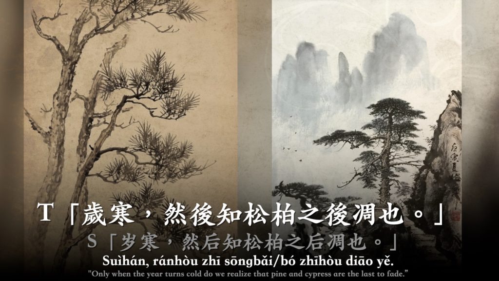 「歲寒,然後知松柏之後凋也。」suìhán, ránhòu zhī sōngbǎi zhīhòu diāo yě. “Only when the year turns cold do we realize that pine and cypress are the last to fade.”